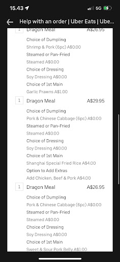 I ordered from Uber for 3 dragon meals with 3 dumplings and 3 mains : sweet and sour pork belly, garlic prawns and shanghai fried rice (the mains was charged extra) including + $4 extra proteins for the fried rice. I didn’t receive the garlic prawns and instead was replaced with the noodle dish. I was disappointed as i was really looking forward for the prawns. As for the fried rice, it wasn’t what i expected as you can see from the picture, there was barely any meat. Shouldn’t have opted for...