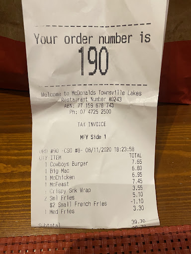 Read moreI come nearly every 3 or 2 days after work because I'm a chef and have no time to go home to cook me a nice meal before having a shower and sleeping for work the next day. I always order no pickles or onions in my burgers. Any how the last few months I'm having to drive back from my house to mcdonalds because they have been putting onions and pickles in my burgers, forgetting to put the meat in my burger, giving me the wrong order or giving me the wrong burger meaning I could've paid $15 for a meal and I get given a meal worth $7. Now I don't usually get angry because I know how busy these people are and the things they go through each day but come on! Tonight I bought the big mac blt and was given a big mac -.- idk if there's a price difference but there is a difference between the burgers. I'm actually too tired to go back and change my burger over, not to mention I have to get up in 5 hours for work. It's not hard to remember one burger, because that's...