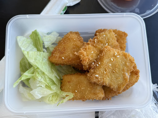 Claims to be open until 3:00. We arrived at 2:15 and were told that we could only have takeaway. We said fine since the reviews raved about the food and figured that we could eat outside. I had the salt & pepper calamari and wife had a tofu salad. Both were the definition of MEH AND my “calamari” had a piece of plastic embedded into it (see photo). That’s what happens when you serve reconstitued food that may or not be 100% what they claim.