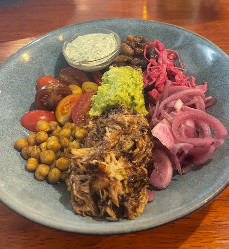 The Green Goddess bowl (+ additional pulled pork) was not at all what I expected. Instead, I received an unusual medley of random ingredients in a bowl, ranging from cherry tomatoes and a few measly spinach leaves, to a pile of sultanas, a pile of pickled onions and pickled cabbage, and spiced chickpeas, all surrounding a mound of avocado. This offering was accompanied by a dish of tzatziki (probably the most flavourful item served).