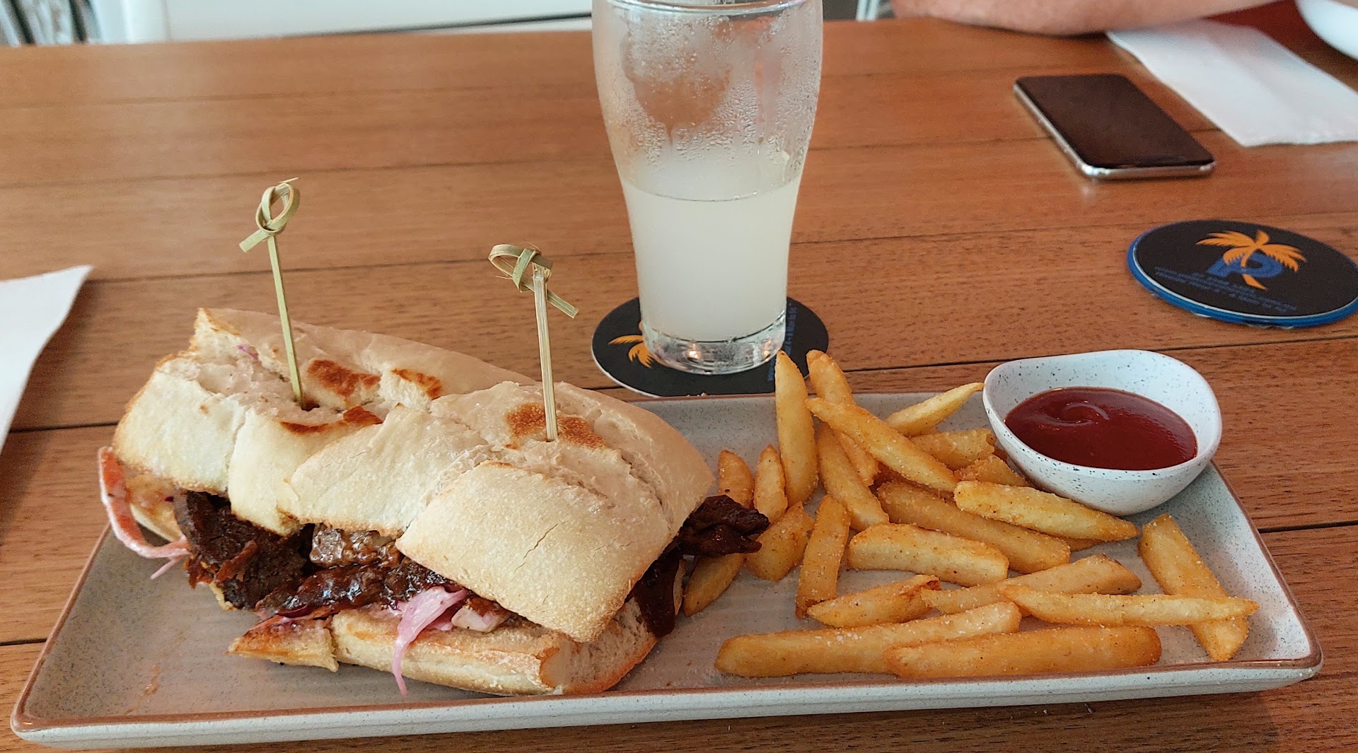 I ordered BBQ Beef Brisket Baguette -- that's a lot of Bs ! It included chips, something I enjoy when they're hot & fresh. These were not. They were served luke warm and I felt like they'd been sitting around for 5-8 mins before being served. Very disappointing. The BBQ beef just didn't taste right -- it was chewy and not enjoyable. The baguette suffered from the brisket's juice or gravy and was soggy / falling to pieces.