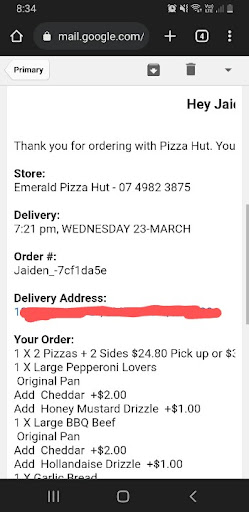The absolute worst customer service I have ever had. I ordered online, order turned up 20mins after expected delivery confirmation. I advised to the delivery person that I do not want the order now and that she could keep it. I later had her brother and a friend of his turn up at my house accusing my husband (whom was on his way home from work and wasnāt even in town at the time of delivery) that his sister told him that my husband threw pizza in her face. I went straight down to the store and she denied saying that to her brother at all. So the message I received tonight was donāt refuse an order from Pizza Hut if they are late because you will get their family members turning up at your house looking...