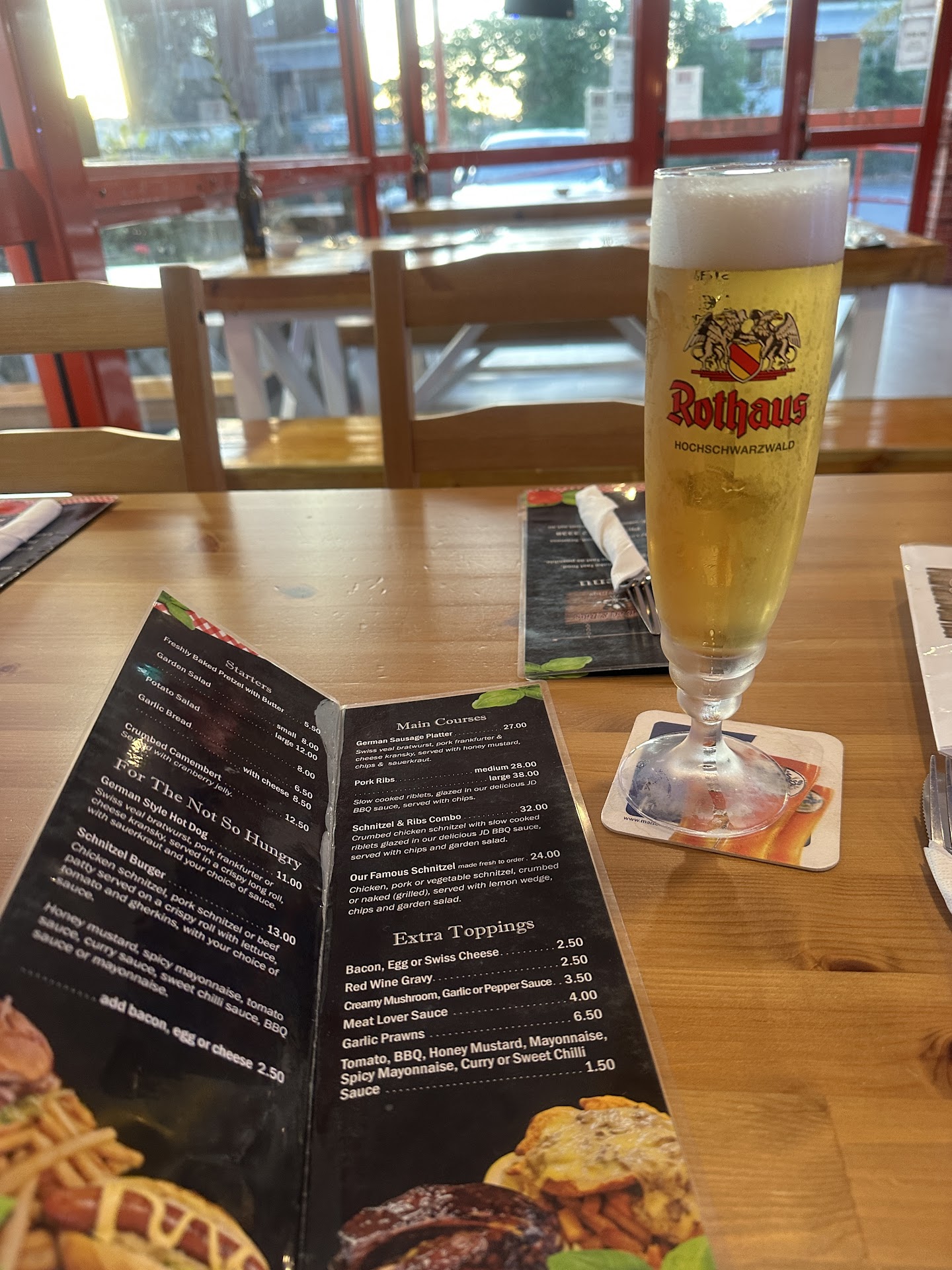 I've heard a few things about this place and I have to say it didn't disappoint. The menu is simple and adequate and it's not 5 star dining. But boy was the service and food top notch. Gigi was a wonderful host and she made you feel very welcome. Her suggestions were practical and turned out to be a real winner. There were three of us, including a toddler and a puppy. This was traditional german fare at it's tastiest including the beer. We had a garlic cheese bread to start and then we shared sausages, schnitzel and ribs accompanied by sauerkraut, chips and a beautfully seasoned salad. We added a few sauces just for good measure. The ribs were succulent, tasty and beautifully cooked. There was nothing left on the bone, yummo, it just fell off. The schnitzel was so tender you could cut it with you finger. Sausages were all spiced to perfection. For me, at a personal level, I love a tasty gravy. The sauce on the ribs was perfect, I would have liked more though. The side sauces, again for me, were just a tad bland and needed more seasoning. Fries were perfectly done. Gerry is a fine chef and has got the mix right. We also dined outside and although there was traffic it didn't detract from our nearly 2.5 hours of relaxing and enjoying a fine, adequate and reasonably priced outing. Special thanks to Gigi for her attention to detail and happy disposition. As Arnie says "I'LL BE BACK". Thank you all for a lovely, simple but deliciius dining experience. Another dining plus for Hervey Bay (in my...