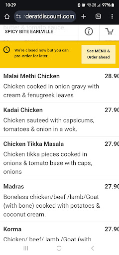 Read moreAbsolutely love Spicy Bites City and Edgehill. Assumed that Earlville store would be the same. Unfortunately, No. They charge top dollar and I expect the best for this price. The gravy was delicious, but the meat was the toughest I have ever had, and I'm not exaggerating! Even the prawns were inedible. It's unfortunately a franchise so you can't count on the same skills. Seems it's a bit hit and miss according to other reviews, so order at your own peril. The manager has kindly agreed to reimburse me. (yet to be received) But I will drive to Edge Hill for my curry from now on. I hope that this feed back will help them improve their product. At this point, I feel that Miss India simply changed names as the curry is...
