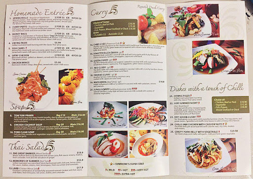 I have eaten at Summerie's a few times, both dine-in and take-away, and have never been disappointed. The staff are friendly and the restaurant is clean and tidy.The front of the brochure menu (shown below) tells you some useful information, such as general allergy information, possible changes in price and that the food they serve may not look exactly the same as those in the pictures. It's a very attractive menu, shows a variety of dishes, and also uses a small cartoon to indicate the spiciness of the food. In the photos below, I have the Mixed Seafood Pad Thai and Satay Chicken. The Pad Thai was very flavourful, the rice noodles were not overcooked and there was a good amount of seafood in it. The Satay Chicken is a personal favourite of mine - juicy and tender chicken and a potent peanut sauce. I've dined in the restaurant for the Satay Chicken lunch special one time and it was also served with a fresh salad, which I was not expecting as it was not included on the menu, so that was impressive. It may seem a little pricey, but in comparison to other Thai restaurants I've been to, others have similar or pricier meals. I think the price is acceptable and the serving size is good, so the money is...