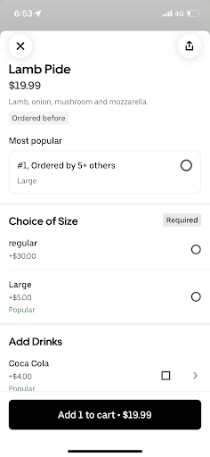 So the food itself was very nice. But this is my complaint, I felt like I got over changed and ripped off. It was expensive on Uber eats. It was $24.99 for kebab and pide was advertised for $20. Which I was fine with. But once you click on size of pide there is no option for $20 only medium which is $30 extra on top of the initial $20 costing $50 for the medium pride or for the large $4.90 extra costing only $24.90!? Which means they want you to pick the large. Which I think is not good practice and dodgy, I didnāt want the large but obviously not spending $50 for a regular. I accepted it and was like whatever can have it for lunch tomorrow. $5 service fee and $1 delivery. Costing $56. Which I thought was overpriced but I was hungry and tired so I purchased it. A few minutes later I was alerted an extra $5 charge for selecting the large pide. So instead of being paying $25 for a pide it was $30. So my total price was $60.88 I couldnāt cancel this order it send a complaint. Food it self was nice. But the over charging and dodgy charging I do not recommend. Especially on Uber. Maybe cheaper and...