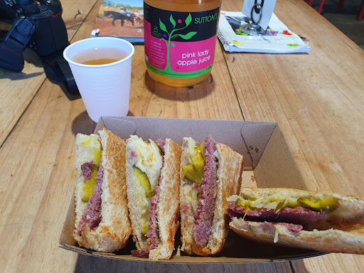 Read moreThis is a perfect stop for a lunch. The apple pie with cream and cider ice cream was the best apple pie I ever eaten, not sweet, just nice, but lot of apple, and that's after I took the really yummy Reuben sandwich - not sure what's all inside, but really nicely toasted sandwich! It's more like a home cooked meal that was cooked with passion, and carefully crafted to perfection. Thanks to the lady who prepared them, thank you. The shed does not look impressive outside or inside, but the lady at the "counter" was attentive and friendly. Few simple tables inside and outside, free sampling of various types of apple juice at self service, and apple juice is bottled on the spot in the shed! There is also a cupboard full of various type of pies and tarts, so beautiful and tempting. When I have time, I will go back for the apple pie, and another go with the Reuben sandwich. Not forgetting, the apple juice IS nice! I had been to the more established and very well built apple shed across the Bass Strait, but Sutton's is not any way less impressive, in fact, I felt more at ease...
