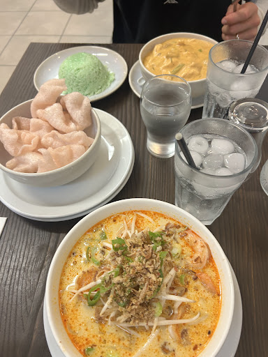 Great little restaurant with tables spaced out not crowded as most of places. Food was delicious and well priced. My seafood laksa has the most seafood I ever had in laksa and all seafood was nicely cooked. It has a beautiful soft lemongrass taste, not hot at all. I asked for extra chili as I like it this way. Hubbyâs garlic and pepper combination was delicious as well. Coconut rice comes in green color and we received a bowl of prawn crackers for free as soon as you sit down. Great little hidden gem (literally hidden- could do with some advertising outside as itâs set inside...