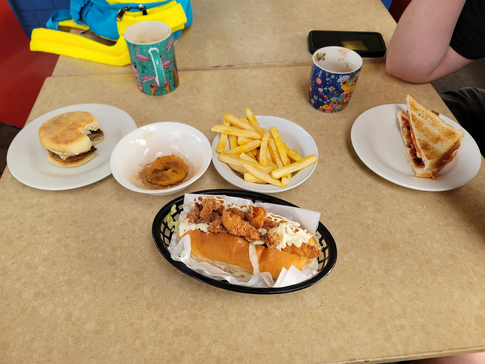 I had a karaage dog, pineapple fritter (with cinnamon and sugar), and shared a small chips with chicken salt with my wife and son, who had a sausage, egg and cheese English muffin (with hummus) and a bacon, egg and cheese toasty (with tomato sauce/ketchup). My wife thought the coffee was especially good (Queensland based bean from a single farm).
