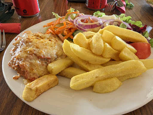 The food, as evidenced by the "lunch size" Chicken Parmigiana pictured was disappointing in the least. The chicken schnitzel, was as big as 3 chips. An almost laughable experience for the prices.