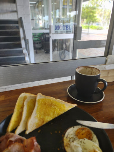 The Royal Cafe, as I experienced it this morning, was a pleasant and professional experience. I was most pleased with the clean kitchen, also dining area, and was most satisfyed with my $10 breaky, (sausage, egg mushroom and hollandaise wrap) and the staffs hospitality. Lizzie was also very satisfied with the pick 3 ingredient omelette, the size & quality was well worth the $11.50, and, naturally, Lizzie appreciated the attention thank you, and I appreciate the acceptance and allowances, that allowed her to experience a little bit of breakfast dining, just like any other person, again, thank you All in all, it's a wonderful place, free water dispensary and newspapers, show the really are doing a good job with their efforts to provide customers with the best experience. My only imaginable critical suggestions, would be... Save time between customers any and every way possible, you might be surprised with the amount of time you could save, making a few changes, big or small. Don't forget, every second to make a new connection (or breath lol), counts (did I mention the food is as quick as any franchise I know), I must say, I was surprised that I could see the 5 stars on display, regardless of what anyone would assume, that's better than seeing 3 stars (no matter how proudly it's shown), I would love to see, everyone else to see five stars, on display, as proud as a certain 3 star takeaway.... with a quality frame. other than the usual OCD kitchen hand stuff, idk what it is, but the place, somthing about the place, the design or layout, seams empty (to me) like it is missing something, and I don't know what. truly, it's rattled around my head for some time now... I would be curious to ask some more people if they have fealt/though the same way. That's the worst Ive got for you, I'm sorry...