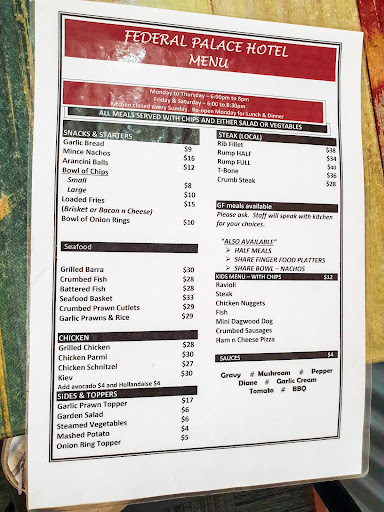 The Motel operator was shocked. I can not recommend this Pub. I did see a sign saying dinner on Friday started at 6.30pm to 8.30pm.
