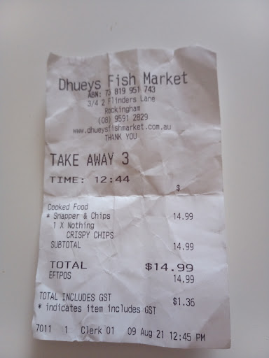 Arrive - awards on the wall look promising. Fish in cold storage inside, looks good. I'm excited. We order the $17 barramundi fish and chips with some extras for my wife. The wait is nothing to note. About 10 minutes. As would be expected. We walk over to a nice bench in front of the ocean and unwrap our lunch. We're hungry and ready to feast. The chips are strange looking, limp but also browned, with mottling suggesting a refrying in tepid oil. The squid rings are anything but crispy. Soggy little elastic bands crusted with damp batter and salt. The dim sim is OK. The crab stick is passable but split open and a mess. The fish. My wife took one look at it and refused to eat it. She's definitely the smarter of the two of us. I was hungry enough that I was willing to take the chance. The batter was sloughing off of the gray, slimy fish, like the skin coming off of a burn victim. It fell apart in the hands like jelly. I ate it, because I have no dignity. We both had a distinct aftertaste in our mouths for several hours, the remnants of whatever gutter oil they use in the kitchen. We weren't poisoned, but both felt queasy for several hours. If we'd actually had gotten sick, im sure I'd be talking to whoever polices food safety in rockingham, instead of this review page.