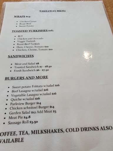 Read moreStopped for lunch on a long drive through as we like to support local businesses. Unfortunately we found the prices to be quite steep compared to other places along the route and even in Sydney. $16 for a toasted Turkish is quite excessive when it comes simply as a sandwich with no sides. The menu was also quite lacking in choice and description. The Parkview Burger was tasty however the wraps are quite plain at their high price point. We had one person at the table not receive their food until everyone else was finished which is just a pet peeve of mine in any establishment. We'll probably choose somewhere different to try next time as there just wasn't enough to...