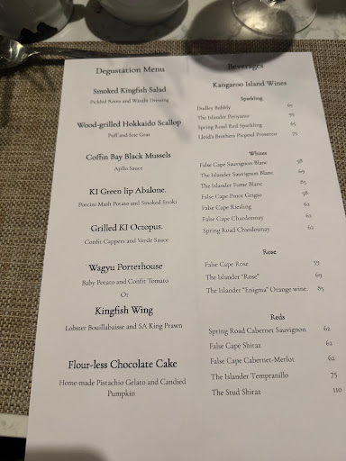 Read moreAmazing foodie fest - an absolutely winning degustation menu heroing local KI produce. Cannot recommend this venue highly enough. Walking up we thought we were up for a schnitty - imagine our surprise when Dhea welcomed us (& Lloyd the dog) with a smile and a simple decision âyes or noâ to an 8 course curated local seafood-forward menu. With wine to match (we picked our own but it worked with the limited, but lovely options - I like that!), there were amazing small dishes that delivered a flavour punch every time. My favourite: the abalone- or was it the marron?! Also, the steak is next level, Chef Nicholas is Argentinian. The best thing, they asked for feedback at the close of a very memorable meal,(with Lloyds wines the main attraction - no relation to the dog I believeđ¤Ł) I donât know when weâll be back - but I hope you will all go and enjoy both the hosts...