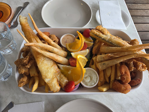 The timing between our entrƩe and main course was perfect, allowing us to savor each dish. For the main, we chose to share the Down by the Sea Platter for Two, which included battered garfish, salt and pepper squid, crumbed prawns, prawn cones, chips, salad, and a selection of sauces. Each item was flavorful and cooked to perfection.
