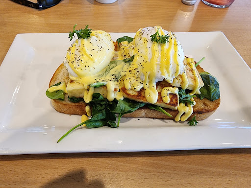 Ye Olde Cafe in Moonta looks like the place to go, but the main thing going for it is it's location and great view. I was served by a staff member, who quickly 'un-served' me when a local came in behind me. The customer then asked me if that was OK that she went before me. This was very awkward for the both of us. I ordered the Eggs Benedict with haloumi instead of bacon, due to temporary diet restrictions. The staff member couldn't find the haloumi on the register because she didn't know how to spell it. This took some time and she had trouble putting my order through as she was obviously getting frustrated. In the end, she didn't delete the bacon and just added the haloumi - this came to a whopping total of $32 including a drink. The food came quickly, mostly because there was barely anyone there. The food, however, was quite good with a generous serve of haloumi. Unfortunately, the poached eggs were under cooked and had "snotty" whites which will put some people off.