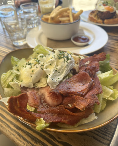 The drinks and food were served quickly and efficiently, our party opting for a chicken satay burger “very nice 👍🏽” the Angry Birds (fried chicken) waffle “tasty but stingy on the chilli and coriander 🫣” and the egg Caesar salad with added crispy bacon “needs flaked not finely grated Parmesan and some black olives - oh, and maybe an option to add anchovies too 😂”