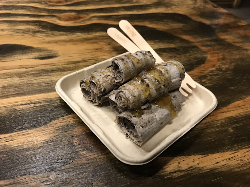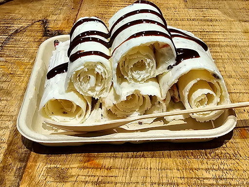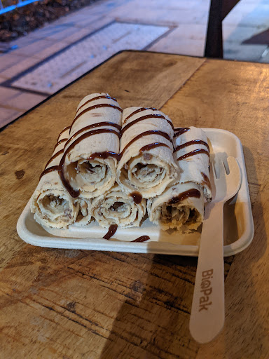 Walking to I Roll, the ice cream store was easy to get to from the ferry terminal. Getting close to I roll, the store is labeled as I roll, decorate with glamorous pictures of rolled ice cream. Walking inside I Roll you are welcomed, the cold plate used to roll the ice cream is positioned at the entrance. Taking our seat my senses were meet with confusion. I could smell a strong scent of spices and herbs. Looking down at the menu I grabbed they were selling Dosa, turns out this is a dual eatery I Roll is also known as Dosa Express (Vegetarian/ Vegan) Indian Restaurant. Swapping the menu for the I Roll menu they had a wide selection from chocolate, fruits, biscuits to Indian flavors to choose from. My friend got the Ferrero roll. She enjoyed the flavor and the nutty texture, topped with chocolate sauce. On the menu instore they offer a Kiwi roll. They don't do this flavor anymore. Choose the Mango roll instead. The Mango flavor was very plain couldn't really taste the Mango flavour, the sauce on top gave it flavor. Would have liked it if they put the sauce on each tier of the rools. If I were to go again I would not choose the fruit flavors based on the Mango experience. Dining in the rolls were presented in a pyramid formation on disposable plate with disposable fork. The lack of lighting, relaxed meditation soundtrack, smell of Indian cooking and the taste of ice cream made of an interesting atmosphere. I cream rolls were fair...