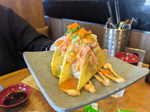 Read moreThis small restaurant has pleasing aesthetic design. It features two partitioned rooms reminiscent of traditional Japanese style (elevated rooms, take off your shoes please), as well as tables and booths both adjacent and non-adjacent to the sushi train. The staff who served us was friendly, and even showed us to a nicer table next to the sushi train when it became available. I don't think I've been to a sushi train before that deviated this much from the classics. It is quite appealing. As I sit here, I'm watching a custard tart, a plate of edamame, raw salmon sashimi, macarons, a young drinking coconut with a straw stuck in it, a caramel slice, honey cake(?) and a plate of sliced seaweed shuffle by. Japanese wines and cocktails are available as well a kid's menu.