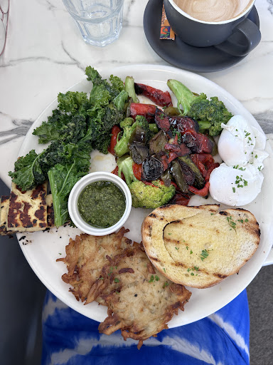 I have given 2* for the coffee and eggs which were pretty good. Everything else was mediocre. One slice of toast barely had any butter but staff did offer to bring more. Some of the toast, haloumi and veggies were burnt. The kale was pretty good but looked like minimal effort had been made and a lot of the tough stalk remained. The pesto was tasty but runny. A lot of the food including, disappointingly, the roast veggies in the Green breakfast, were greasy - too greasy for us to eat. The side of avo was the most disappointing - $4 for half an avo literally just sliced, scooped and dumped, bordering on overripe and with large black sections that could easily have been removed if a little more care had been taken over presentation.