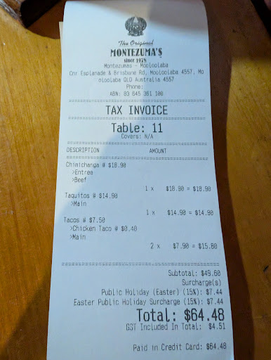 Read moreWe have been hooked on Montezumas for decades. We know what to expect. But unfortunatley the Mooloolaba restaurant has failed to uphold it's franchise quality and expectations. We have tried this restaurant numerous times over last year and this year, but it's not just an isolated case of having a bad day. It has been continously disappointing. The quality of the food has deteriorated and as far as good service goes, there is none. Each time we had to wave staff down to order drinks. Then wave staff down to order a meal. Then wave staff down to order another round of drinks.This was lunch time on a Saturday and our party of 3 were the only ones there. This place used to be full of patrons and always had to make a booking in past years. There is so many opportunities to make this place popular again. Training of staff to provide good service would be the first place to start. Prior to this day, we visited through the week for dinner. There were approx. 5 parties dining there on this night for an early 6.00pm dinner. Unfortunately it was the same old story. I looked around at the other tables and noticed that each table, like ours, had empty glasses. The staff couldn't be bothered to collect empties and ask if we would like another drink. What a wasted revenue opportunity. Again, we had to try and get eye contact with the staff to order another drink. Regretably we cannot possibly dine...
