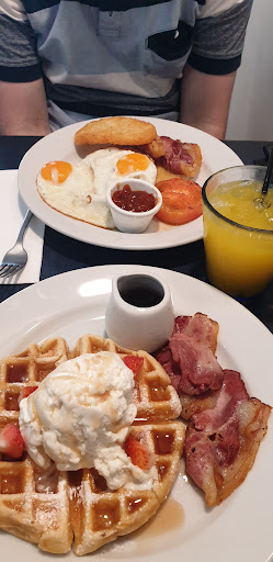 Pictured: Eggs and bacon with added tomato and hashbrown (perfectly cooked I must add). Belgian waffle with vanilla gelato and maple syrup with added bacon. 1 large glass of freshly squeezed...
