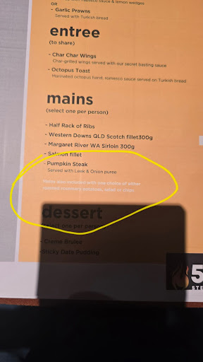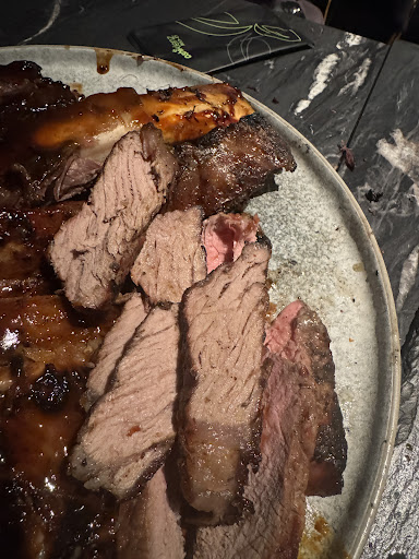 Read moreFathers Day Feast - unfortunately not, more like 500 degrees of frustration. After eating our fill with plenty of food left over and more to come which never arrived, my son asked me what would I give this restaurant experience out of five stars. I said the first question I ask myself is would I came back and the answer is NO so an automatic fail and I would give a 1 stars, he asked why and this is what I said. The menu was confusing, particularly the shared platters which we wanted, and none of this was explained to us such as the the quantity/serves, and choices/combinations. We were forced to spend $75 per person so had to order food we didn't want and knowingly couldn't eat. We were upsold sauces, why I don't know all the meats were slathered in the same BBQ sauce ribs, chicken wings and lamb chops, the sausage and wagyu were spared sort of but on the same platter. The wagyu was served bleu and requested med-rare. The blunt knives we were given unable to cut through the raw meat. The lamb was also bleu, which I asked to be medium. I would have expected the waiter to understand the meat cuts and best way to cook/serve and make the recommendation. But nothing. The wings were not rendered enough so the skin, was slimy and undercooked which has a horrible mouth feel. We ordered a salad which we couldn't eat as swimming in dressing which tasted like it came from a bottle off the supermarket shelves.