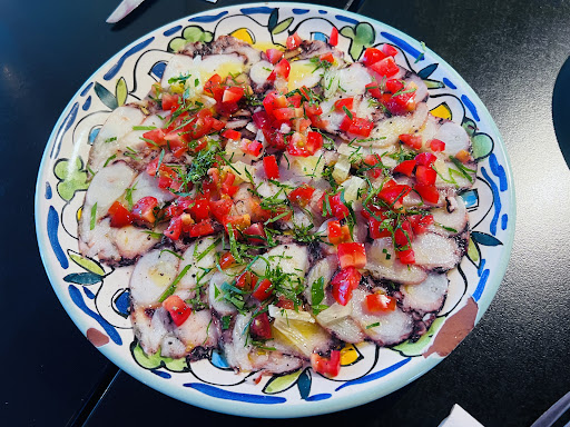Read moreMay 2022 Dark, moody with upbeat pop music that makes you want to dance. The front part of the restaurant as you walk in is reminiscent of a wine bar with tall bar stools, barrels and bottles on display. But don't be fooled as there are plenty of tables all the way down to the back including an outdoor section. As soon as you walk in, you are made to feel welcome by Maurizio, with his Italian charm. His pace of service, knowing when to check in, when you are ready to order, made the whole evening that much more enjoyable. There is a concise list of wines by the glass at very reasonable prices and a menu that had many tempting options. The pizzas are a must here with a thin base & chewy, soft crust. I enjoyed the potato & sausage pizza which was super tasty with a good hit of rosemary fragrange. The nduja pizza (not calzone) was generous with ricotta making it creamy & rich but would have liked a little more nduja to provide more kick & saltiness to the ricotta. The spaghetti with seafood was light & refreshing & ravioli (more like a tortollini shape) was generously filled and tasty. Dessert was nice. Overall, the combination of atmosphere, service & food made it a very enjoyable experience.