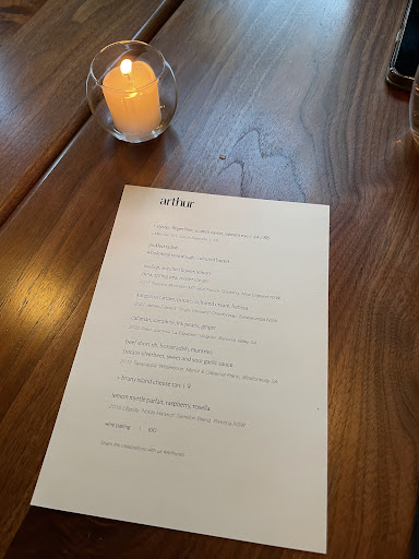 Read moreOk going a bit south with this review. There were some real delights on the menu … but the experience was disappointing. No love. We went on Xmas eve and it feels yuppie to complain when you are being served in family time. For me my husband is my family and as a chef in training it takes a lot for him to splurge on a degust. The on arrival moment was … no smiles. Some confusion about table and then a seating with a scripted here’s what 5 course is about. Zzzzz. Not a big cocktail list and I ordered from menu .. big mistake . Think of a sour cordial of yuzu and citrus overpower. The drink is the first exhale when you sit down to a treat. My partner tried to get it modified but it was unsavable so he drank it in one gulp to avoid spoiling his palate. A dirty martini to my rescue proving that classics are always best. Harry’s lemonade was flat and exchanged. The food got progressively better though. The chicken liver tart, Scallop-esque thingy in xo and zuchinni stuffed with sea spaghetti were my faves.. a lamb noisette main also hit the spot. They had scallops and a cheese tart as ‘extras’ .. not a big fan of extras. It’s a degust not a build your own menu by $$ option 😞 if these were incorporated in the 160 per head it would be perfect . The bill came with no recognition of the bad start. Even knocking the lemonade off would have been adult. 🤷♀️ food is life and high end end food is a treat . The chef is ex Dead Ringer a place I’ve loved for decades. The switch to fine dining has IMHO lost a spark. The food did save the noche buena meal but food is an act of love. I’d love to see that play out a bit more at Arthur. Has potential.. needs some human...