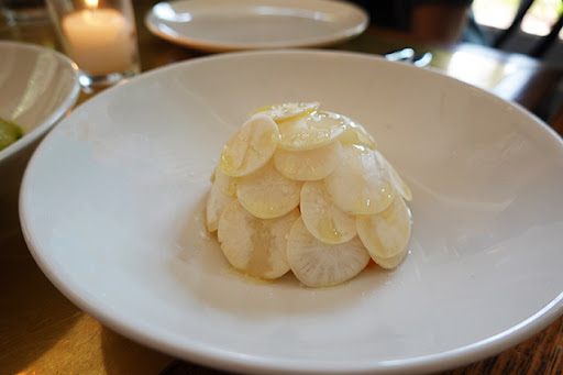 The next pair of dishes, goldband snapper with super-salty chicory in the mix of greens, and beetroot and sour blood plum under a hat of rapa, worked together well. It’s honest cooking that lets the produce do the heavy lifting, with enough weight towards vegetables to make it feel like you're eating a balanced meal. Portioning was handled well for our table of five, with a bigger portion for three people and a smaller one for the diners eating as a pair.
