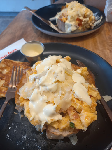 Ordered the Italian scrambled eggs. It was huge and delicious. Lots of eggs, was not light on the serving. With a thick piece of bread underneath. I would have liked this bread a bit firmer but it did have eggs sitting on it. I asked for hollandaise sauce on the side, otherwise usually poured on top. I could have been fine with a half serve for just myself.