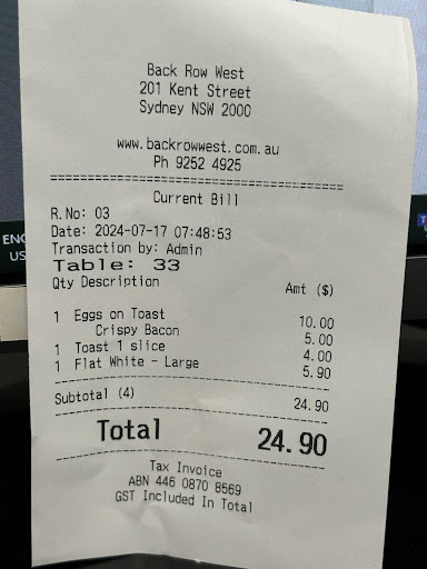 My go to order is eggs on toast with a side of bacon and a large flat white. Although the cost of a 2nd peice of toast is $4, I accepted it and the staff would normally give me a 2nd butter to go on it with the price included in the $4 extra toast.