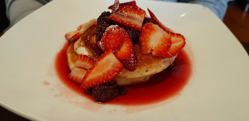 The pancakes were not any better. They were quite dry and bland and complemented by both fresh strawberries and what appeared to be frozen microwaved berries (including frozen strawberries). Why any establishment would think it's appropriate to serve customer frozen berries is beyond me.