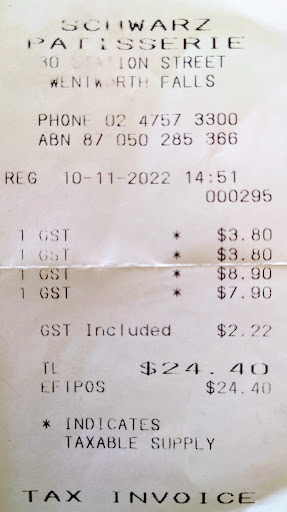 On the way back to Sydney from Katoomba we stopped at Wentworth Falls for a bite to eat. Unfortunately all of the other options were closed as it was some time past 14hs (or maybe 15hs) and we ended up at Schwarz (to their credit they were open - but perhaps that's the only way to get people in!). From the old dated looking dining room, to the lack of enthusiasm from the staff and the bland pastries and weak coffee, there was NOTHING that could redeem this place.