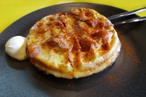 Just like the brekky hot dog, the Cheese âWaffleâ Melt ($12.90) was new to me. It takes a thick, savoury waffle and tops it with bacon and more gooey melted cheese, then dusts it in mild paprika that's has more colour than flavour. The cheesy, doughy, creamy waffle is more hectic than it looks, so we ask for chilli - they only have flakes or sweet chilli sauce. Our requested chilli flakes improve the dish tenfold, with their lively heat balanced by the quenelle of sour cream.