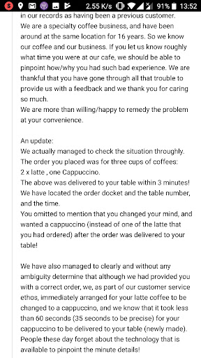 What I did probably led to that customer having a negative experience. And if they do write an online revue that is negative I want that to be seen as my fault, and in no way a reflection of the quality of Bean Drinking. I am a regular, I love this place, and would hate to see what I did negatively affect the business in any way.
