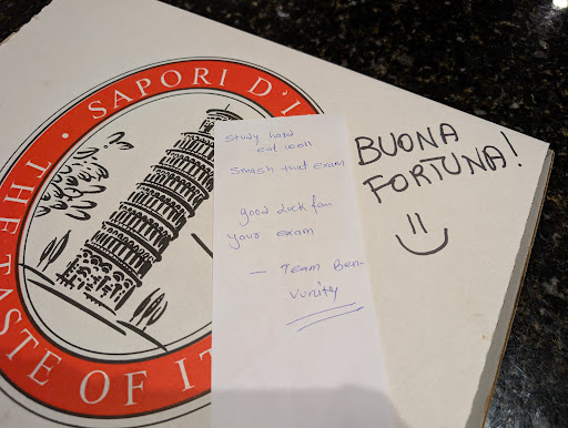 This time, I was nervous about an upcoming exam and asked in my order if someone could write a nice message wishing me good luck for it, assuming that it would get skipped over as they were busy. Lo and behold, I see "Buona fortuna" written on the pizza box, and an incredibly sweet handwritten note saying that I'm going to smash the exam. Words cannot describe how grateful I was for the care and attention to detail from hospitality workers, who are usually understandably overwhelmed, especially when I arrived to pick up my order and saw the restaurant was packed! Not to mention that the pepperoni pizza was absolutely delicious too.