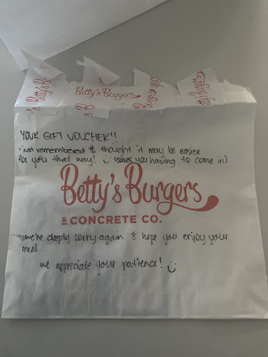 Read moreVery accommodating staff who go above and beyond. Iâve loved Bettyâs burgers for years and came in as usual yesterday. My friend and I didnât realise our burgers were mixed up as one was placed with the wrong side so my allergens and intolerances started reacting the moment I bit into it as I was exhausted and didnât thoroughly check as I usually do. We not long after realised the mistake that occurred on both ends. The person handling the situation (I never got her name) was very emphatic and understanding. Even if I didnât request it because I felt horrible about the it she had the food remade correctly, ensured my well being was safe and met when it came to the nausea I was experiencing and provided a complimentary gift for next time I am in. I have never experienced to that level the service and human empathy like that in other food venues prior when errors from either side have occurred as Iâve usually been invalidated or ignored because of my health needs. I want to recognise her and say how amazing she was at handling that circumstance when we were all confused and I in particular was overwhelmed physically and emotionally. Thank you and I highly recommend supporting this location due to amazing service and good food (when you eat the...
