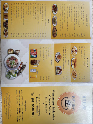 I have eaten Pho, all over Sydney, I can't get enough of the stuff. I am afraid the quality of what we have right here in Engadine at Billy's Bowl might be lost on many of those who haven't tried it before and aren't sure what that mysterious bowl might contain. Even if you are a meat and 3 veg. type, give it a go. We have the best here in Engadine and if you try it at Billy's Bowl you won't be sorry. That isn't to mention all the other fine dishes that they have at Billy's Bowl. There is a huge menu that covers most, if not all your favourite Asian dishes. I still have to try many of them. Why? Because, even when I have made up my mind try something else. I order the Pho, but the chicken wings are great, five spice pork rolls, satay and sang choy bow are all delicious. Service is professional, staff are wonderful. About time we had something more than just sweet and sour and fried rice, here. Thanks guys for bringing the best of Asian cuisine to us in Engadine. See...