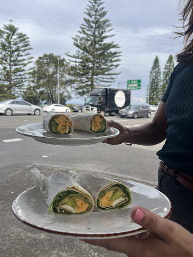 We had two delicious brekky wraps with scrambled eggs, halloumi, avocado, and spinach and some sides of mushrooms, cooked spinach, and fresh tomato (their menu has cooked tomato but for dietary reasons we needed fresh and they were more than happy to oblige). Tasty, fresh, healthy-tasting. well-seasoned, not too oily. Also fresh OJ and a soy cap, both great.