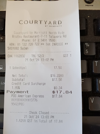 Read moreThe Bistro Sydney is located at the lower level of the Courtyard by Marriott Hotel. They have a $17.50 Lunch Menu where you can buy such meals as a schnitzel or burger, etc, with a non- alcoholic drink. The surroundings was pleasant and the service very good. I just got a schnitzel and chips and an orange juice for lunch. You can drive in and park (on the first left turn off, after entering via Talavera Road). A ticket will be issued at the boom gates which can be validated for free parking. Otherwise the parking would have been $22. Otherwise you can catch a Metro train to Macquarie Station and from there it's a 7 minute walk. They do accept Amex cards but with a 1.95%...