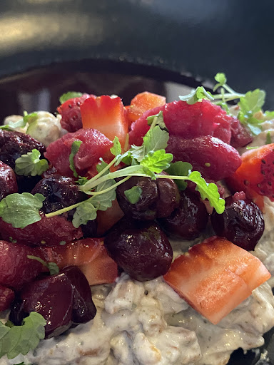For a sweet option, thereās a vegan dish - Cherry ripe granola - dried cherry and cacao nib, coconut, wattleseed yoghurt, rosella glazed cherry jelly and granita. A great option on those hot days too.