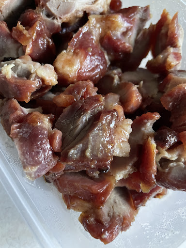 1kg - pork ribs ($28), less fatty than chunks off roast pork or bbq pork - still incredible flavour, but my personal preference, is the smaller chunks of meat from the ribs as I don't have the hunk of unchewable fat.