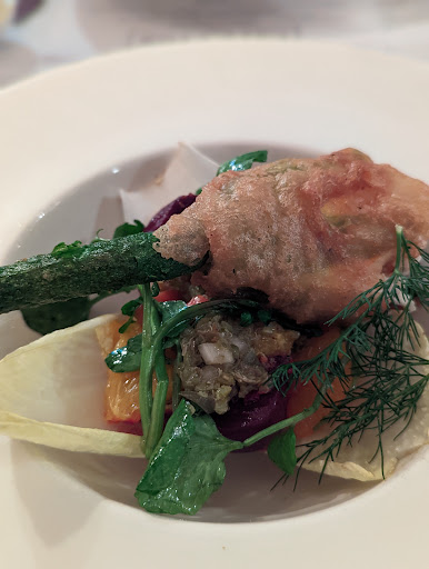 We enjoyed a delicious 3-course dinner, starting with the entrée on special for my partner, the ceviche, which was fresh and tasty. I had a zucchini flower stuffed with goat cheese. I particularly enjoyed how the chef played with textures: the silkiness of the goat cheese was nicely complemented by the crunchy toasted walnuts.