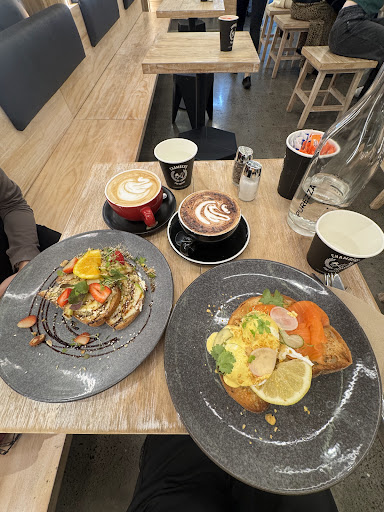 We had the burrata bruschetta toast, the smoked salmon eggs benedict, a flat white, and a zebra mocha.