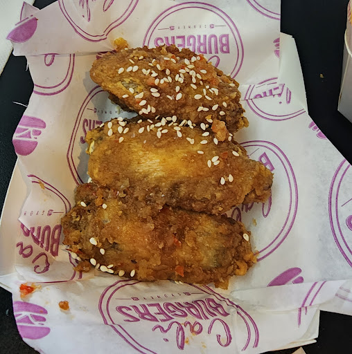 Ordered: Double Cali burger (no tomato no onion) combo, Garlic honey wings, Onion rings, Lemon lime bitters,