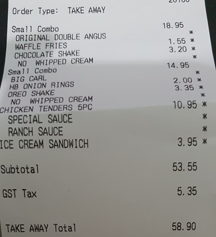 A couple of other points. I feel the price point is a little on the high side for the QSR segment. I get I ordered a "premium" burger, but the above came to $25.85. That's creeping towards $100 for a family of 4 and in the suburban gourmet burger restaurant range. Also (only a minor thing), the receipt looks like they are adding GST onto the prices displayed, but they are actually included in the prices. The way they display it is a little quirky.