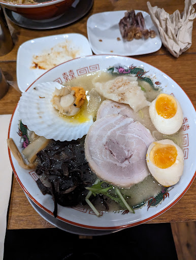 A lovely little ramen joint with gorgeous interiors, ambience, service, and food to match as well. Prices as expected as an above average ramen joint, the food was definitely worth the experience too. We started off with a yuzu beverage and a lychee calpis slushie, which were both super refreshing and sweet. Then we had the soft shell crab sushi, it was just as good as I had expected, and I was happy to had tried it. The crab was cooked really nicely, it retained a certain crispiness I hadn’t had anywhere else, and the flavours were jam packed. The ramen was delicious, and I had asked for some of toppings on the side, and they accommodated me well with a decently large portion. I had a special ramen at the time, it was a spicy ramen with a bunch of toppings included. It wasn’t all too spicy as well, which is not a problem since there was a slap of chilli paste on the rim of the bowl that I could add to my liking. The ramen was absolutely brimmed with toppings, it was about $30 so It made sense, but I was shocked at how generous they were. It came with karaage chicken, dumplings, egg, and the classic bamboo and fungus (on the side). I was full before I even got halfway through it. The flavours were great, the savoury of each condiment blended well with the broth, and nothing were ever too dominant or overpowering in each bite, though you’d ideally have a bit of one savoury topping on its own instead of a mix. It was an absolute pleasure to eat here and I’d love...