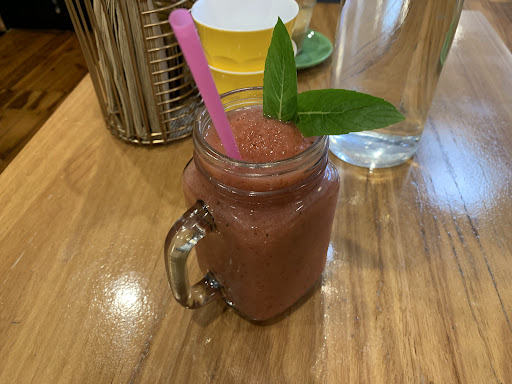 Strawberry Mint Smoothies Crushed strawberry with mint and coconut water. Can not catch coconut taste. Not sure exactly they put the dried mint inside or not. Garnish with fresh mint. Flavor is not strong enough. Need more sweet syrup and sour taste. Taste is ok but not balanced. 6 /10